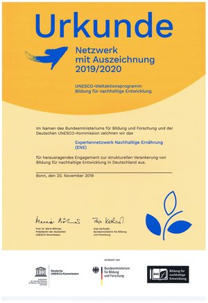 Ausgezeichnet wurde das Netzwerk von der Deutschen UNESCO-Kommission und dem Bundesministerium für Bildung und Forschung (BMBF) für seine herausragende Arbeit: „Das Expertennetzwerk Nachhaltige Ernährung ist ein außerordentlich aktives Netzwerk, das Bildung für nachhaltige Entwicklung im Ernährungsbereich stärkt. Die Aktivitäten des Netzwerks tragen sowohl auf nationaler als auch auf internationaler Ebene erfolgreich dazu bei, Bildung für nachhaltige Entwicklung strukturell zu verankern und in die Breite zu tragen.“