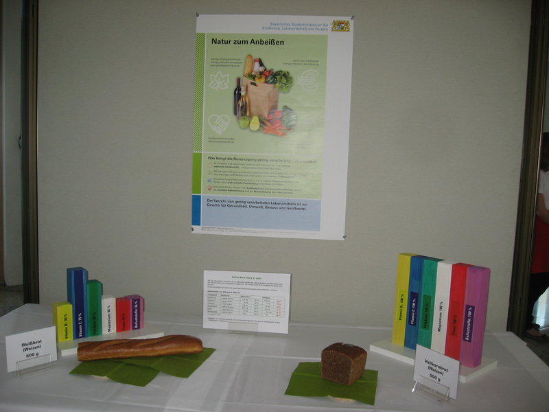 „Das "Konzept Ernährung in Bayern" umfasst auch die Thematik „Bewusstseinsbildung über die Konsequenzen des Verbraucherverhaltens beim Lebensmitteleinkauf“. Dazu wurde eine Plakatausstellung "Nachhaltige Ernährung - Essen für die Zukunft" bestehend aus sieben Plakaten erstellt. Eine Begleitbroschüre zur Ausstellung erläutert die Plakate und gibt Hintergrundinformationen. Anlass für die Konzeption der Ausstellung war die Tatsache, dass sich seit den 1950er Jahren das, was, wie, wo und wie viel wir essen, grundlegend geändert hat. Essen wird immer weniger selbst zubereitet und geschieht oft nebenbei. Selten kennen wir die „Geschichte“ eines Nahrungsmittels. Wir wissen wenig über den Herstellungsprozess, die Transportwege und die Handelsbedingungen. Dabei hat Essen und Esskultur erheblichen Einfluss auf Umwelt, Wirtschaft, Gesellschaft und Gesundheit. Dies gilt regional und global.Zielgruppen für die Ausstellung sind Schulklassen sowie alle Verbraucherinnen und Verbraucher, die mehr über Essen im Kontext „Nachhaltigkeit“ erfahren möchten. Die Plakate eignen sich auch für die Präsentation in Räumen mit Laufkundschaft, wie z. B. Foyers von Behörden, Banken etc.“