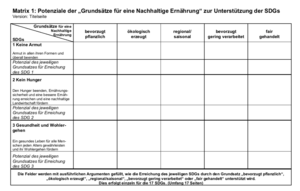 Systematische Erfassung der Argumente zur Unterstützung der SDGs, bezogen auf fünf „Grundsätze für eine Nachhaltige Ernährung“. Matrix mit fünf Spalten für die Grundsätze – jeweils für alle 17 SDGs.